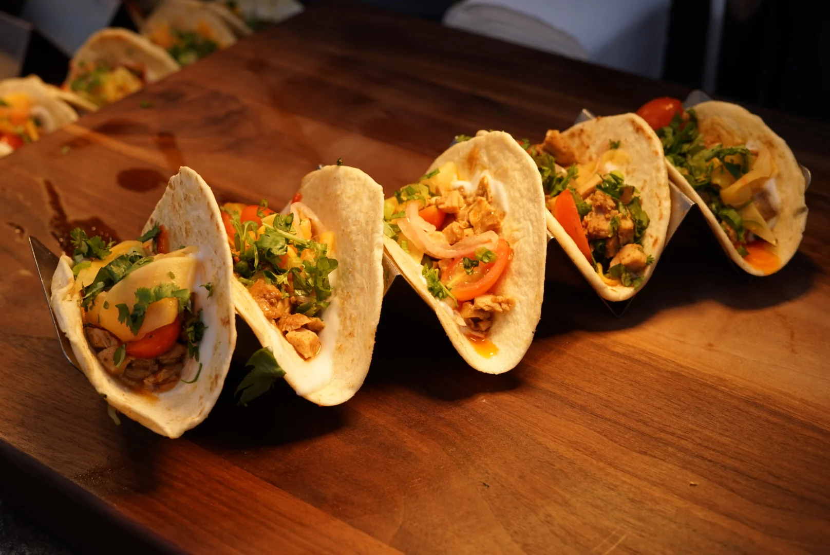 Line of tacos filled with meat, vegetables, and cilantro on a wooden serving board.