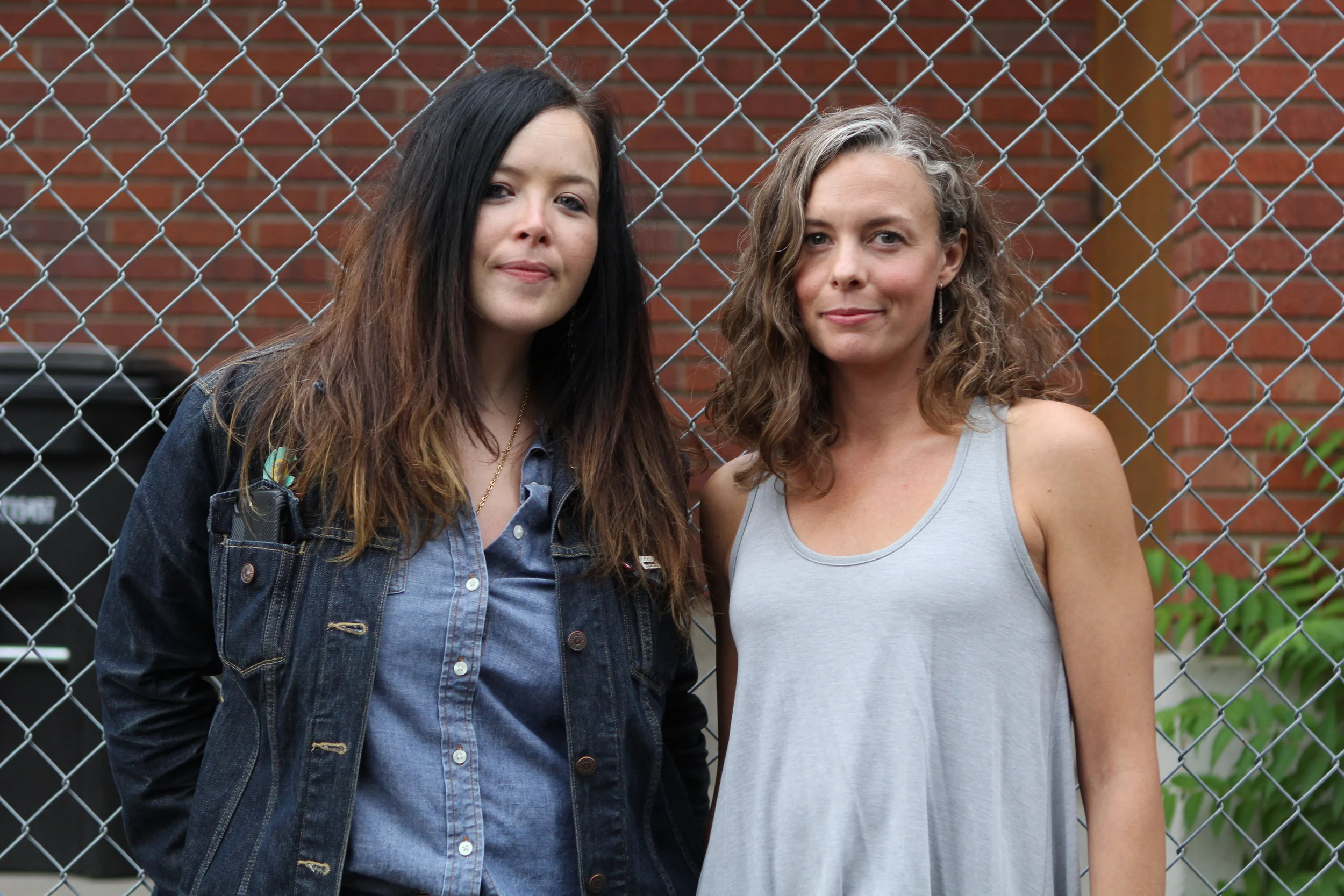 Two young women standing back-to-back on a city sidewalk surrounded by trees and parked cars. One woman wears a red leather jacket and jeans; the other wears a yellow jacket, crop top, and shorts.